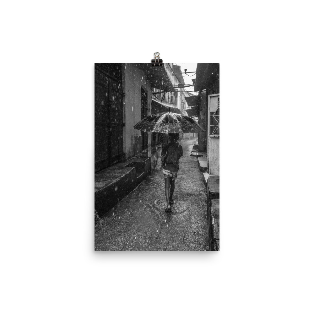 Umbrella held high, a boy leaps from puddle to puddle in Stone Town’s flooded lanes. The black and white image radiates youthful exuberance, showing that even the rain brings joy in Stone town.